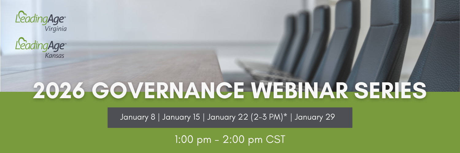 The 2026 Governance Webinar Series is hosted by LeadingAge Virginia, and is therefore subject to the policies and procedures of their organization. As such, registration for this webinar includes digital handouts and tools, one connection to the live webinar, and instructions for receiving CE credit/ attendance certificate for one person. A recording of this webinar is NOT included in the registration fee.