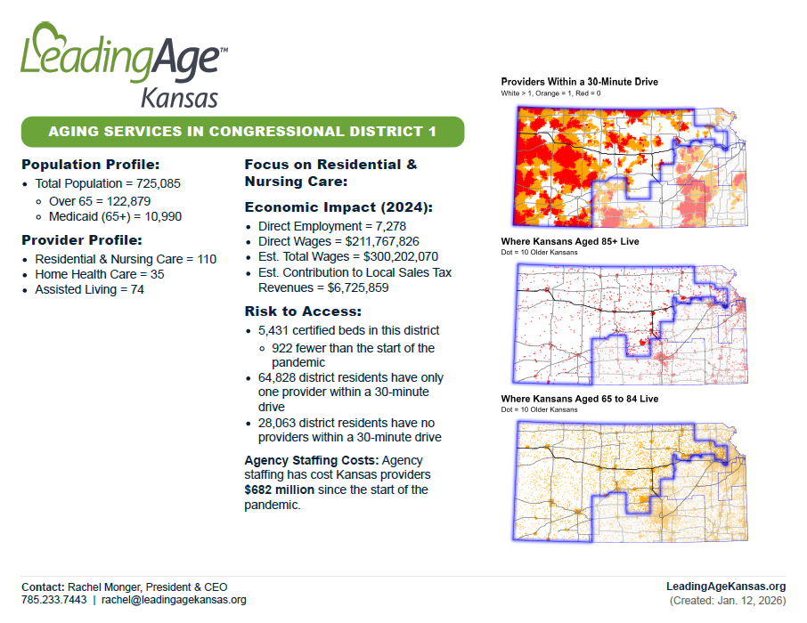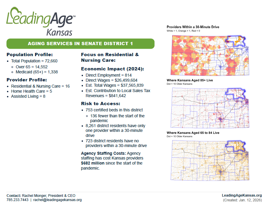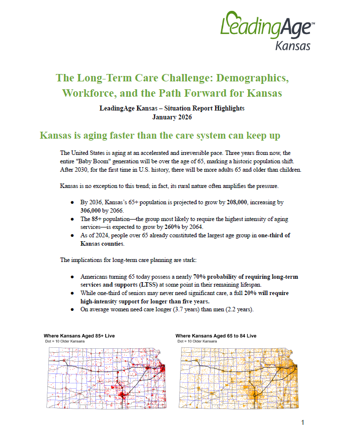 LeadingAge Kansas is dedicated to identifying strengths and needs for the full continuum of aging services in Kansas. We utilize the information gleaned from these reports to help formulate our legislative priorities each session. Learn more about the growing population of seniors, declining workforce, and policies impacting aging services by downloading our reports below.